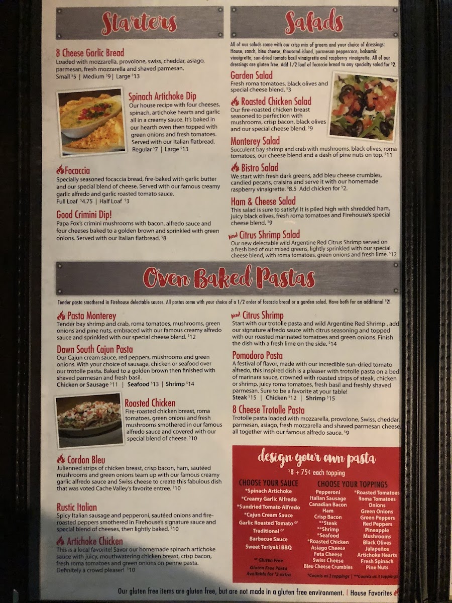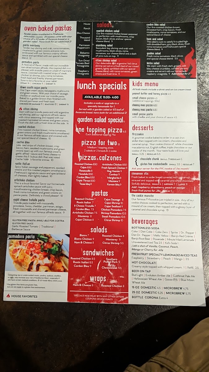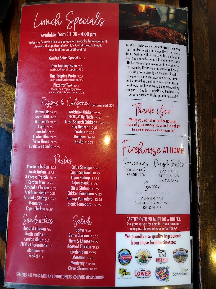 Welcome to Firehouse Pizzeria, located at 682 Main St, Logan, UT, where delectable flavors and comforting dishes take center stage. Our menu is a vibrant tribute to Italian cuisine, featuring a range of enticing lunch pastas such as the savory Chicken Pomodoro and indulgent Cajun Shrimp, all priced affordably. You can also enjoy our fantastic lunch specials, like a one-topping pizza that’s perfect for sharing or a delightful pasta lunch for an amazing value.